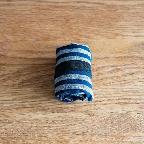 縦3つ折りにしてクルクル丸め、付属のゴムで留めるとコンパクトになります。